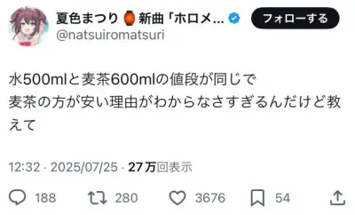 人気ホロライブVtuber「水500mlと麦茶600mlで麦茶の方が安い理由がわからなさすぎる」