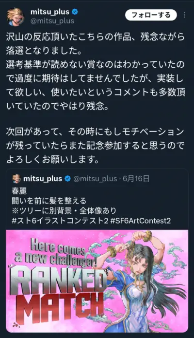 【悲報】スト6イラコンに応募していた絵師さん、落選しお気持ち表明「選考基準が分からず期待していなかったが評判だったので残念」
