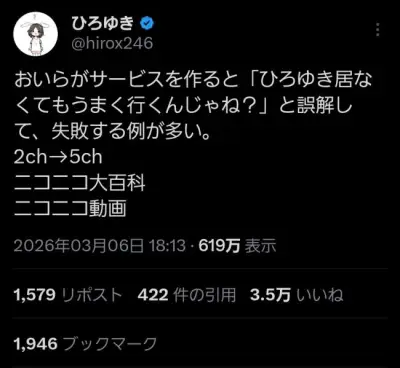 ひろゆき「おいらが作った5chとかニコニコ動画とかで、おいらが居なくてもうまくいくと誤解して失敗する例が多い」