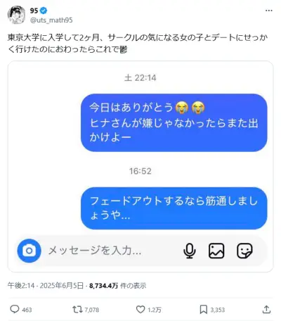 【画像】東大に入ったチー牛、女の子にチー丸出しのLINEを送ってしまう