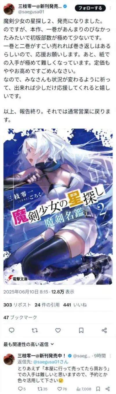 【悲報】大物ラノベ作家さん、涙の訴え。「1巻が売れなかったので2巻は発行部数がかなり少ないです。お願いだから買ってください😢」