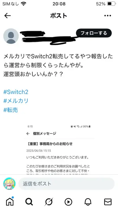 【速報】メルカリさん、switch2転売ヤーを通報したユーザーを利用停止措置祭りにwwwwww