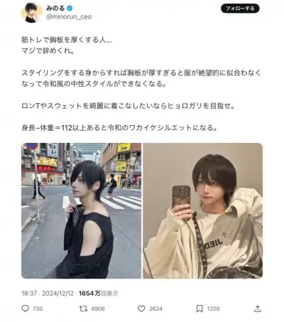【画像】イケメン「男は筋トレやめろ!!!ヒョロガリ目指せ!身長-体重=112でワカイケシルエットになろう」12万いーね