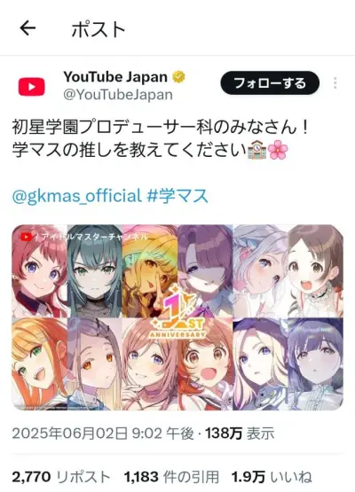 【悲報】YouTube公式、アイマスに媚びるも『推し』という言葉を使い逆に叩かれる