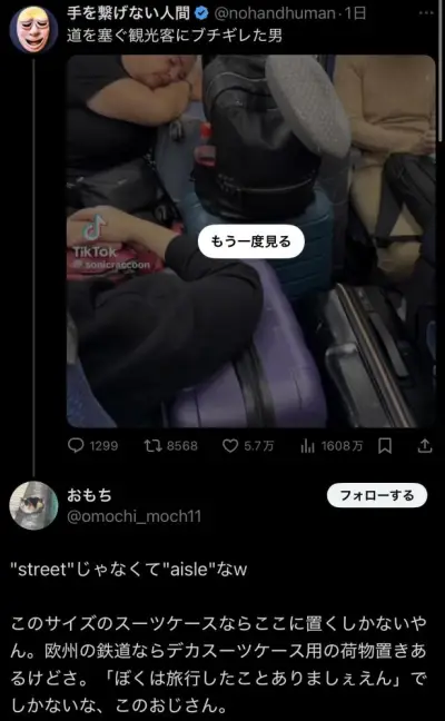 【動画】日本人、電車の通路にスーツケースを置いていた外国人観光客に怒鳴り散らす