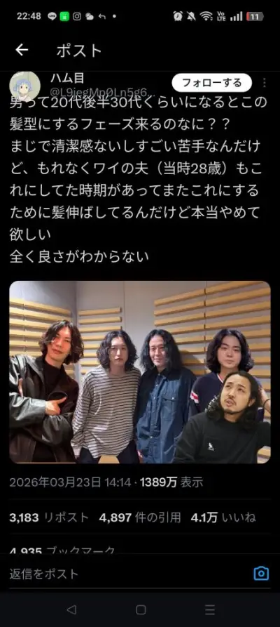 【画像】X女性「米津とかキングヌーとかキタニタツヤとか菅田将暉とか又吉みたいな髪型嫌い!!!」←4万いいね